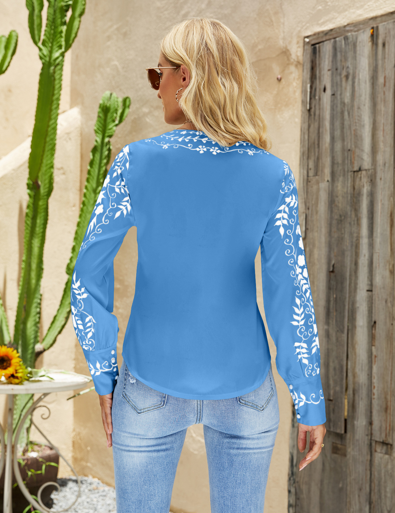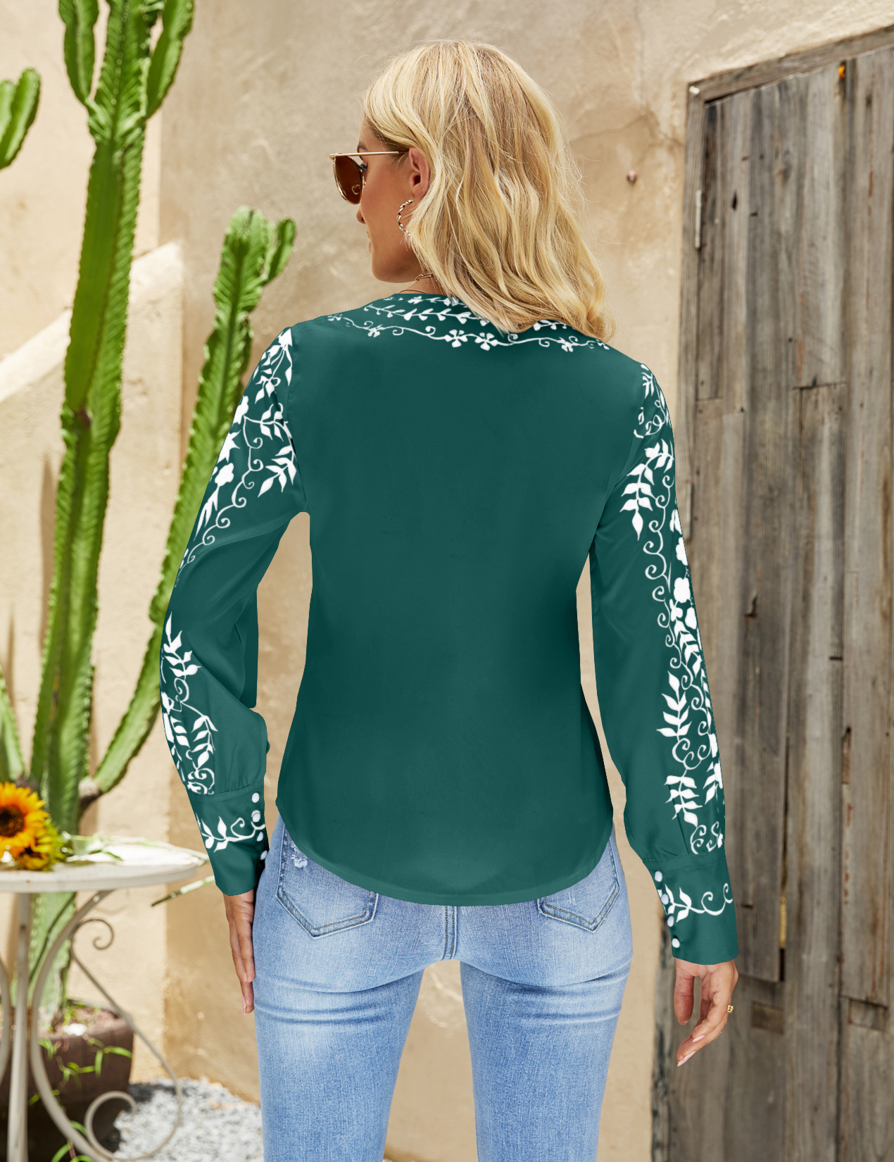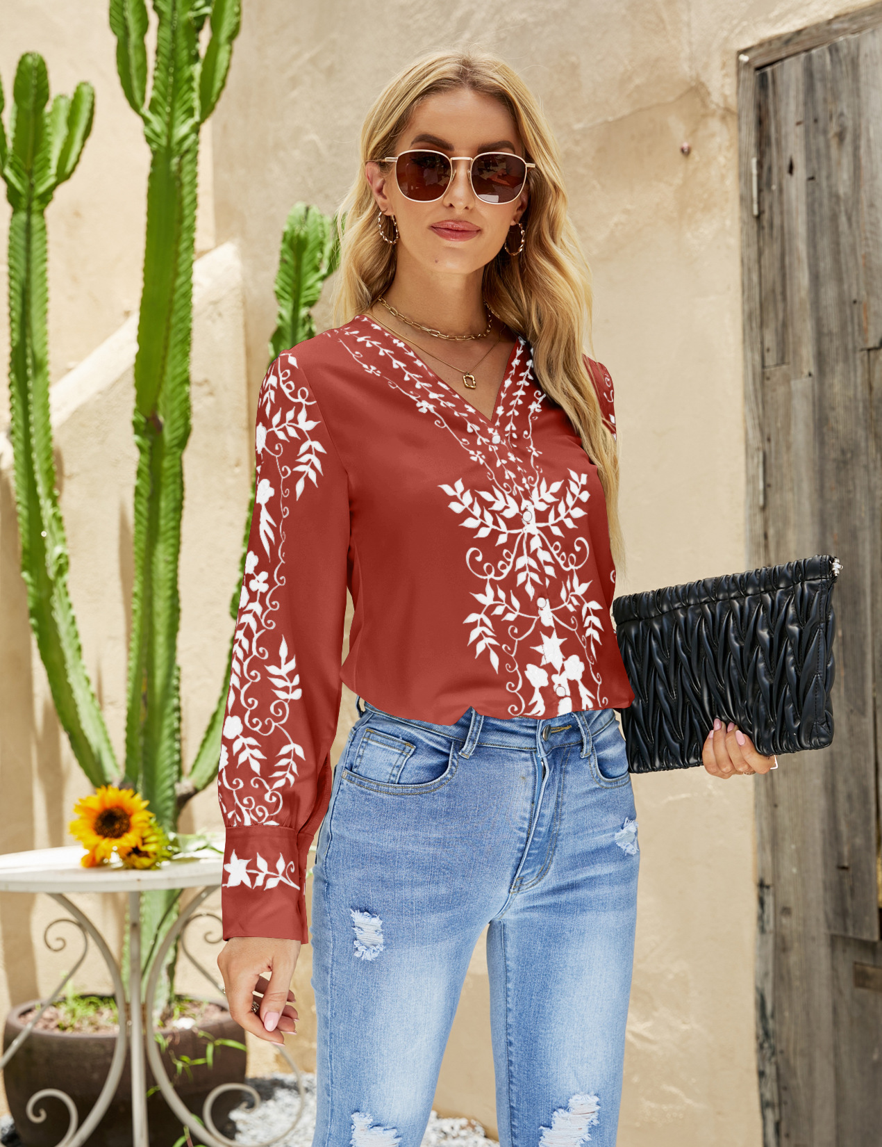 Top Shirt Ethnic Print V-neck Casual Long Sleeve Shirt Women Clothing